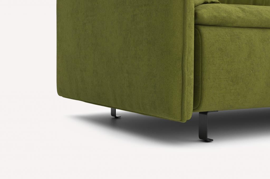 Опоры дивана могут быть выполнены в черном или золотом вариантах, подчеркивая его элегантный стиль.