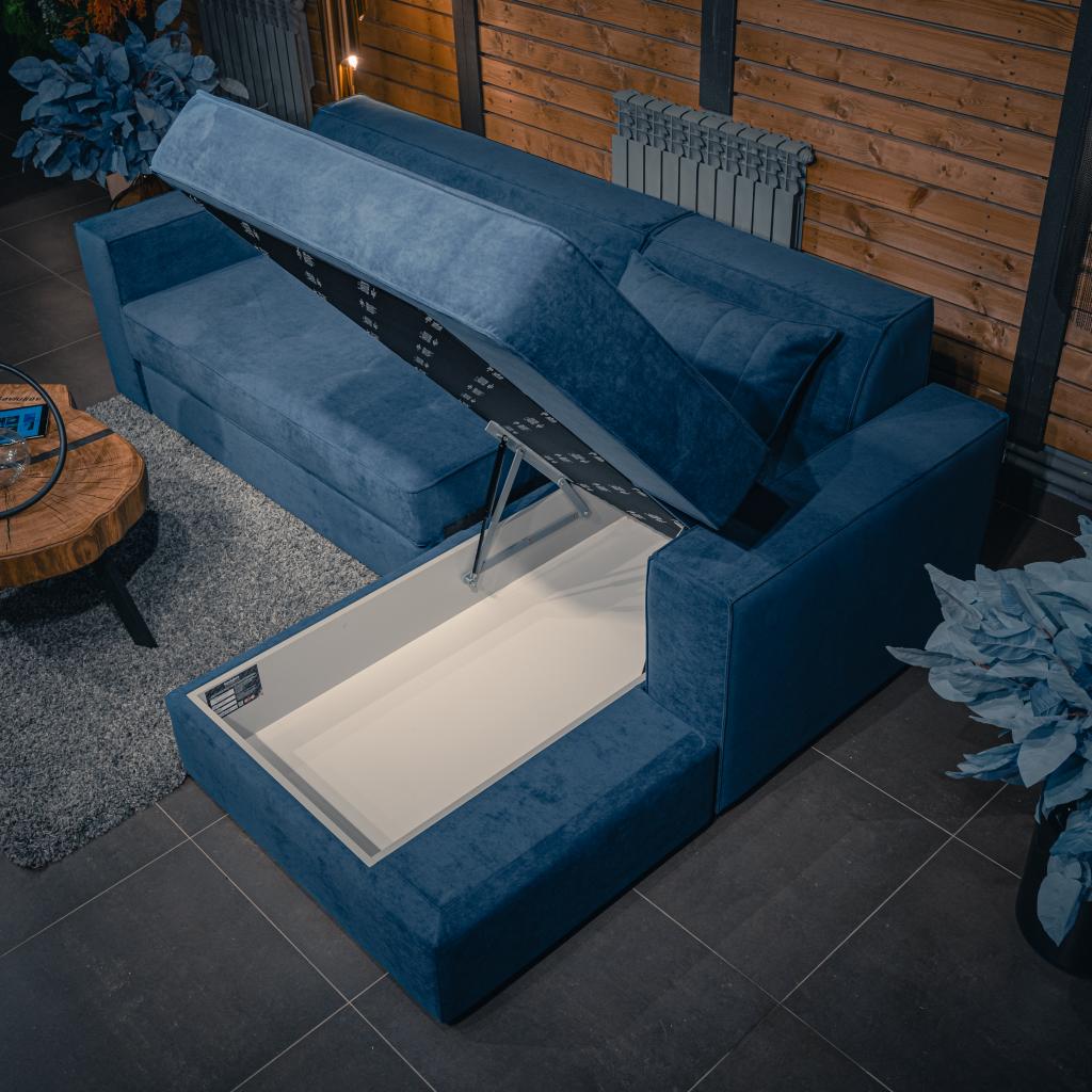 В вариантах с оттоманкой в угловой и П-образной конфигурациях предусмотрена вместительная ниша для хранения, обеспечивающая удобное размещение постельных принадлежностей и других предметов.